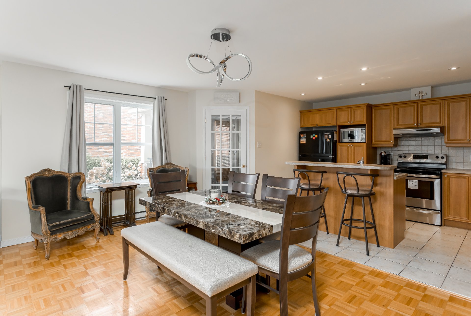 Dès votre arrivée, vous serez accueilli par un espace de vie lumineux à aire ouverte, favorisant une ambiance conviviale et chaleureuse. Le salon s'intègre harmonieusement à la salle à manger et à la cuisine, créant un environnement idéal pour recevoir ou profiter du quotidien. La cuisine, bien pensée et fonctionnelle, se distingue par son îlot central et ses nombreux espaces de rangement.