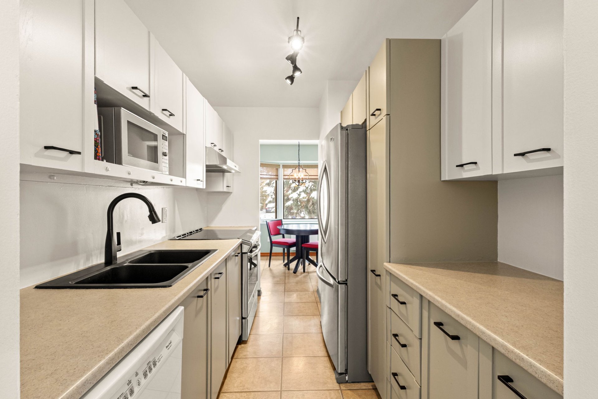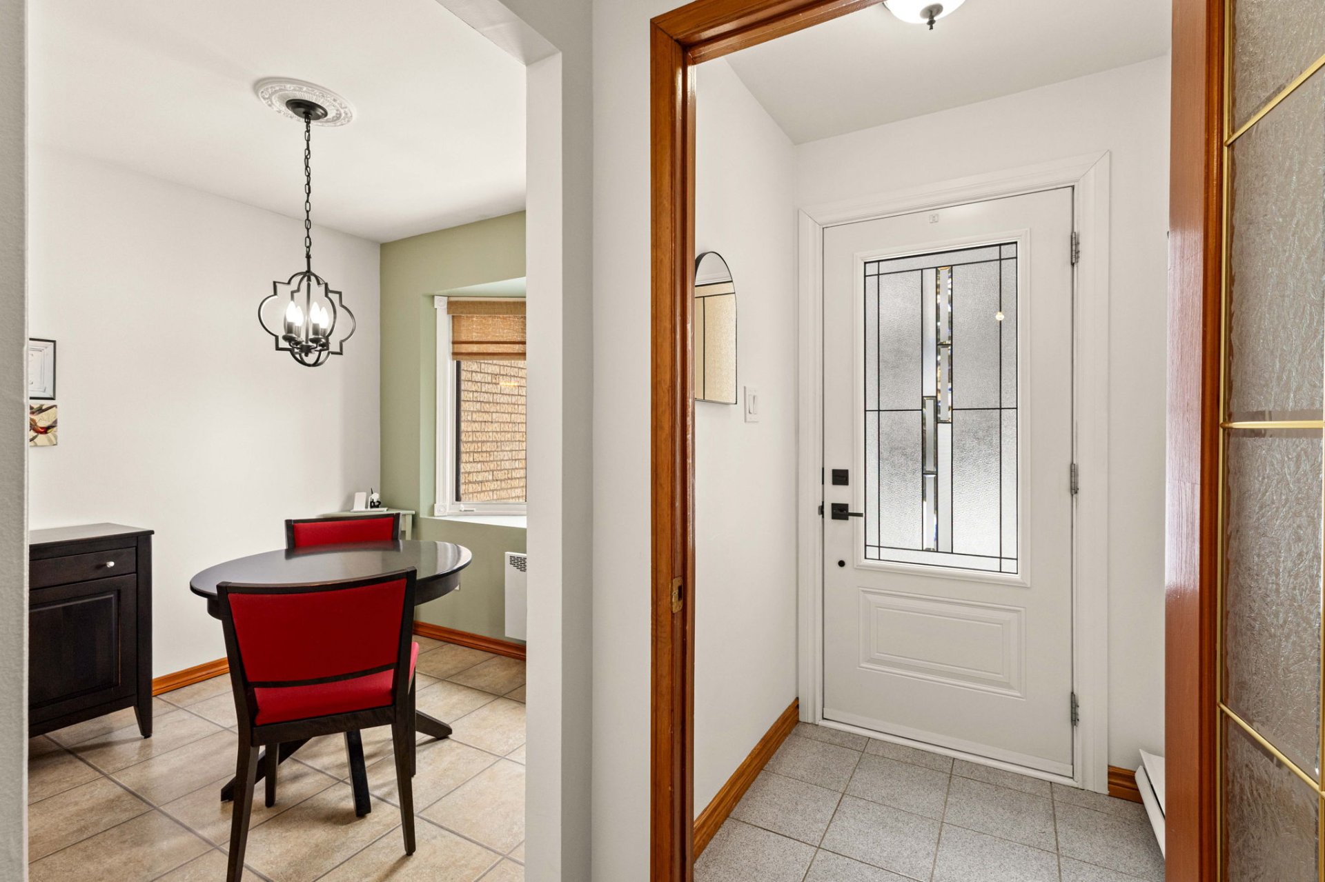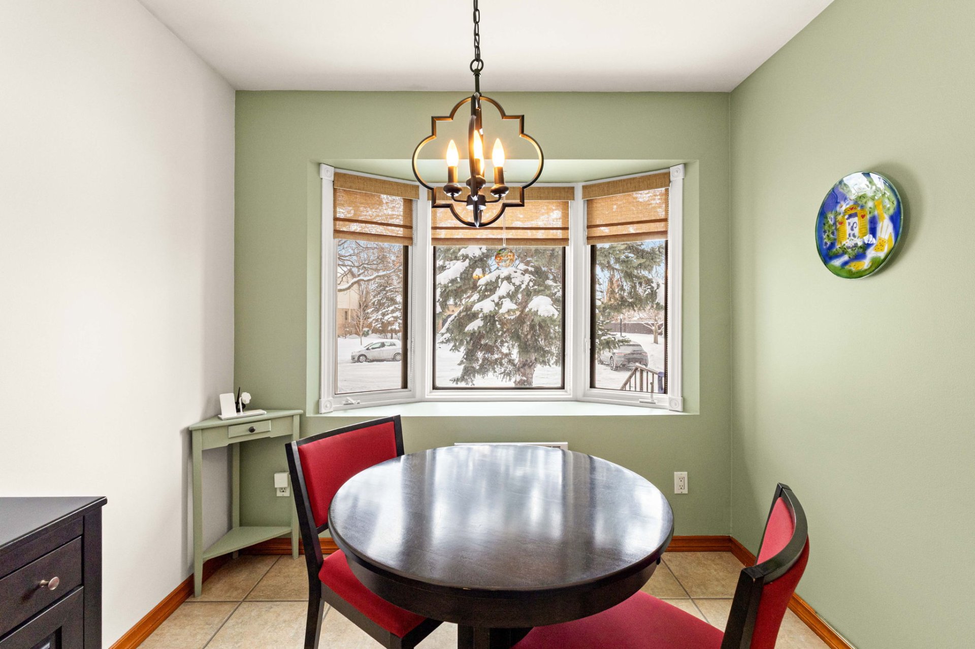 a windowed dining area bathed in natural light. The cozy